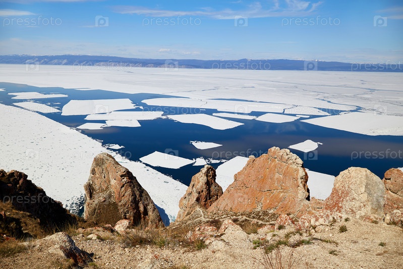 К северу от острова Ольхон весной в солнечный теплый день. Красивый вид с мыса Саган-Хушун