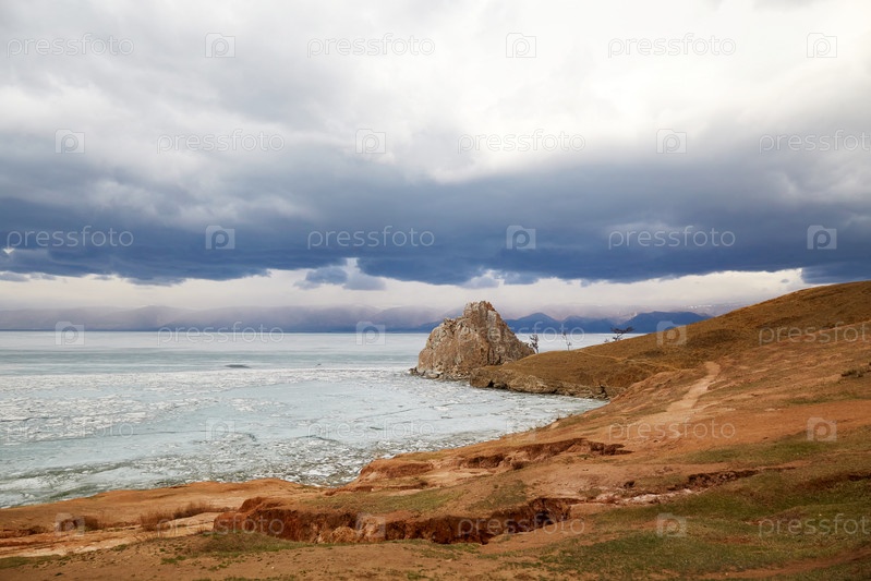 Прекрасный вид на мыс Бурхан или скалу Шаманка на острове Ольхон в пасмурный весенний день