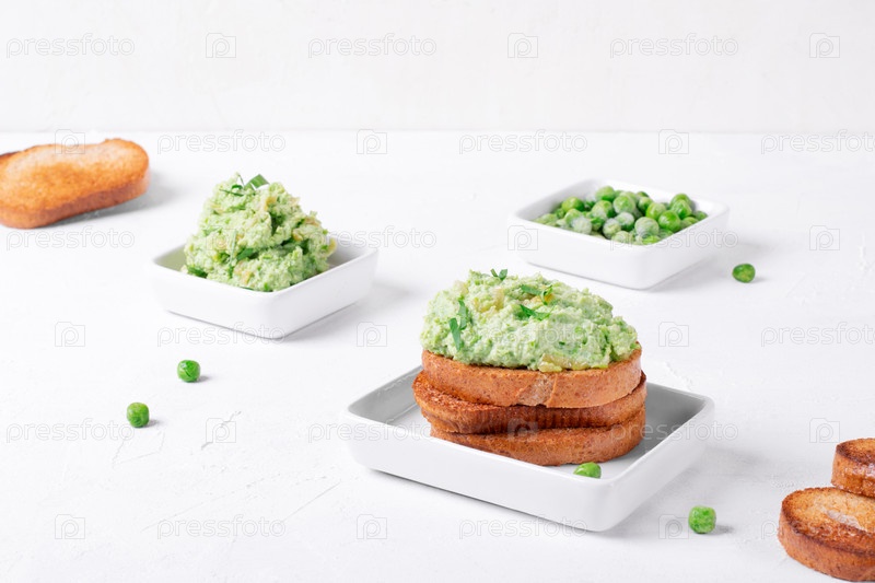 Паштет с зеленым горошком на поджаренном хлебе с отрубями подается на белом столе с ингредиентами. Здоровая веганская паста