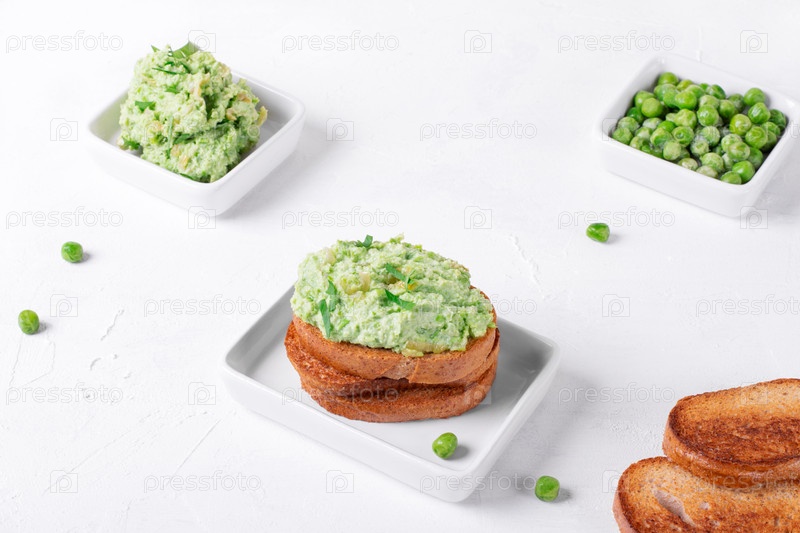 Паштет с зеленым горошком на поджаренном хлебе с отрубями подается на белом столе с ингредиентами. Здоровая веганская паста