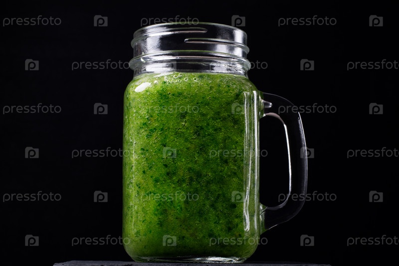 Зеленый коктейль в стеклянной банке на черном фоне. Смешанная капуста, яблоко, груша, апельсиновый сок и вода. Напиток для здорового питания