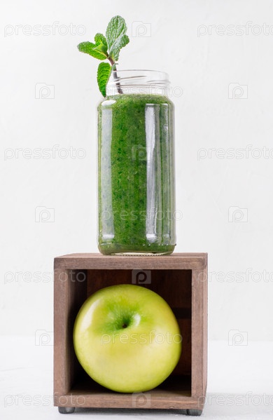 Зеленый коктейль в стеклянной банке поверх деревянной коробки с яблоком внутри на белом фоне. Креативное фото полезного напитка
