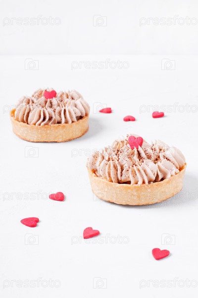 Мини-пирог Banoffee с сахарным сердцем на белом столе. десерт с бананом, иррисом и сливками в День святого Валентина