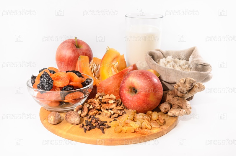 Тыква и ингредиенты для тыквенной запеканки с орехами и сухофруктами на светлом фоне