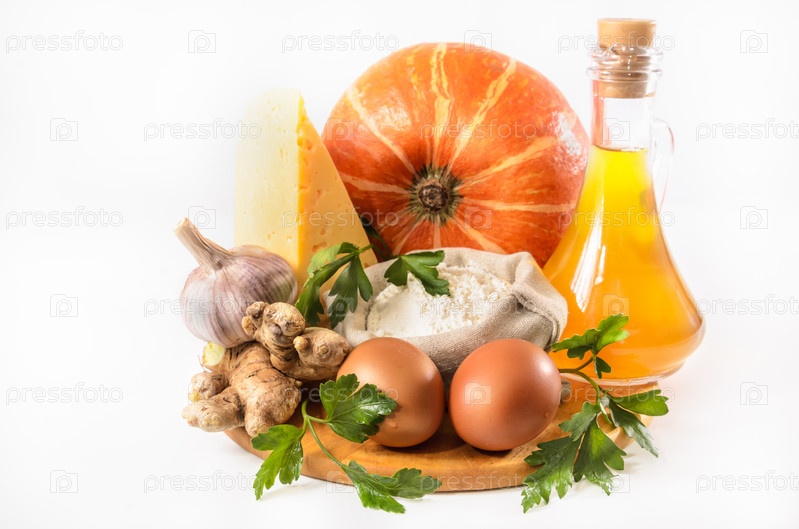 Тыква и другие ингредиенты для тыквенной запеканки на светлом фоне
