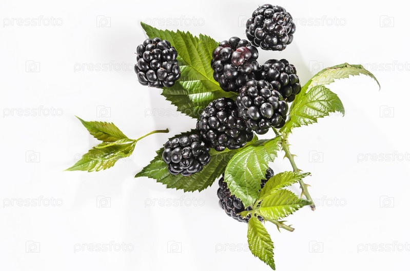 Спелая ежевика с листьями на белом фоне с мягкой тенью