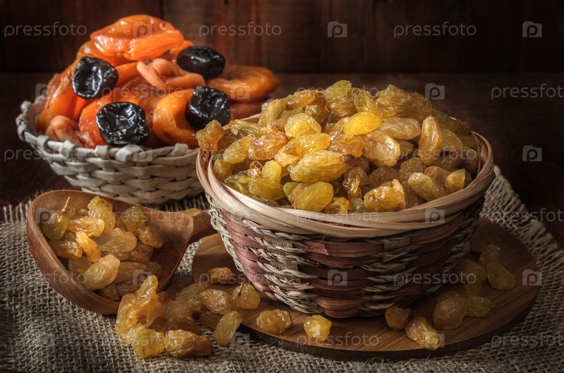 Изюм в корзине и другие сухофрукты на темном деревянном фоне