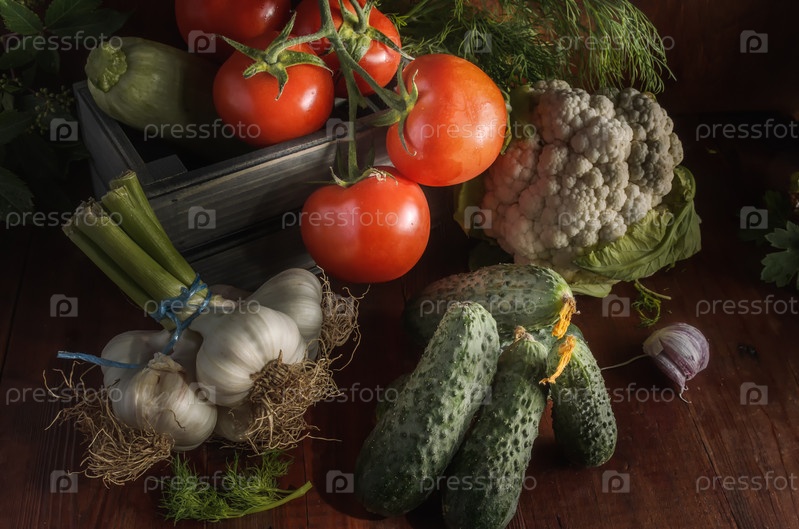 Спелые овощи на темном деревянном фоне в деревенском стиле