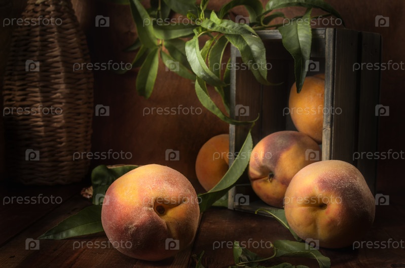 Спелые персики в деревянной коробке на темном фоне в деревенском стиле