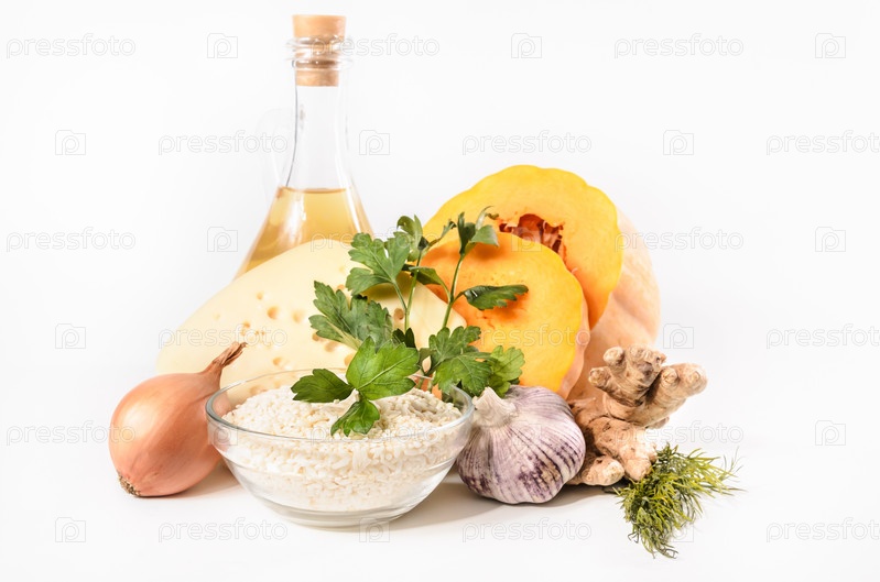 Тыква и ингредиенты для тыквенной запеканки с рисом на светлом фоне