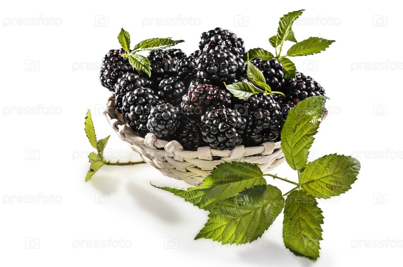 Спелая ежевика с листьями на белом фоне с мягкой тенью