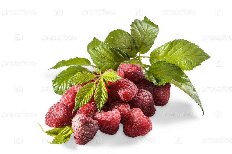 Спелая малина с листьями на белом фоне с мягкой тенью