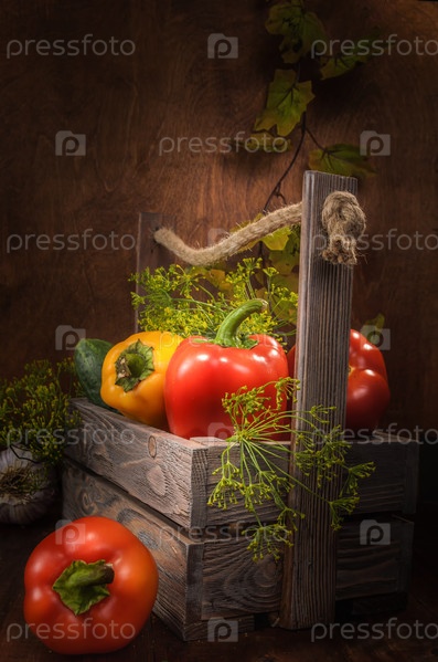 Свежие овощи в коробке на темном деревянном фоне в деревенском стиле