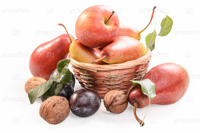 Груши, сливы и грецкие орехи на белом фоне с мягкой тенью