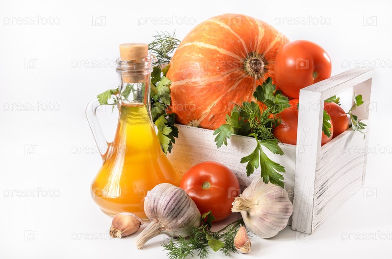 Тыква, помидоры и другие ингредиенты для овощного блюда на светлом фоне