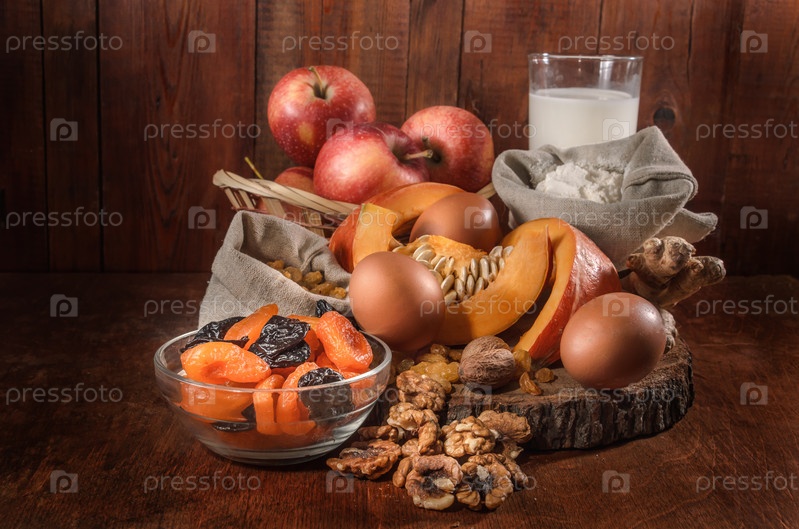 Тыква и ингредиенты для тыквенной запеканки с орехами и сухофруктами на темном фоне