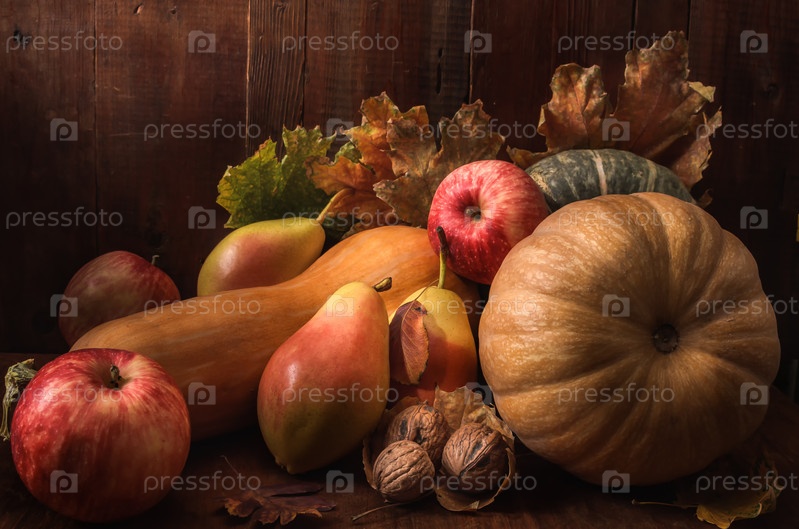 Тыква и фрукты оптом на темном деревянном фоне в деревенском стиле