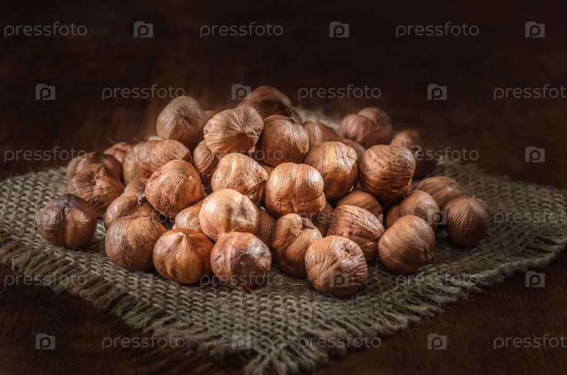 Фундук на салфетке из мешковины на темном деревянном фоне