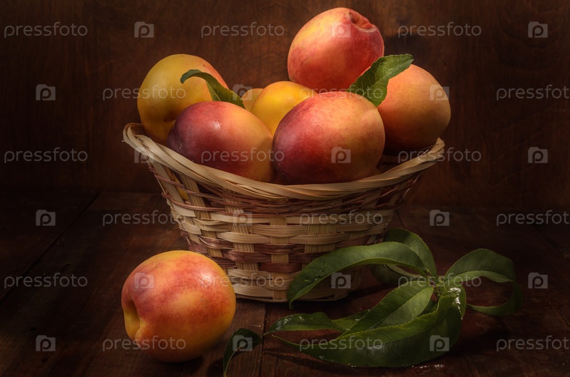 Нектарины в корзине на темном деревянном фоне в деревенском стиле