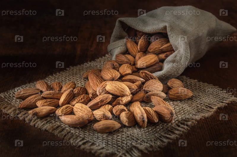 Миндаль в тканом мешке на темном деревянном фоне