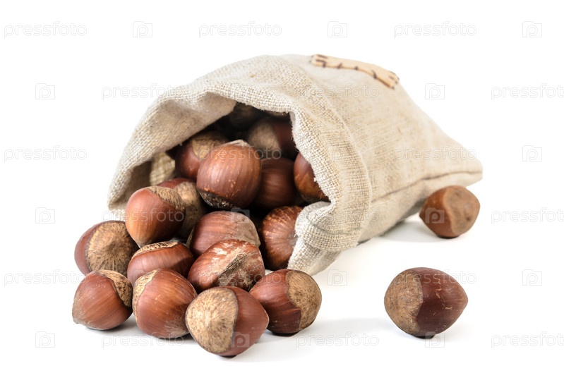 Фундук в тканом мешке на белом фоне с мягкой тенью