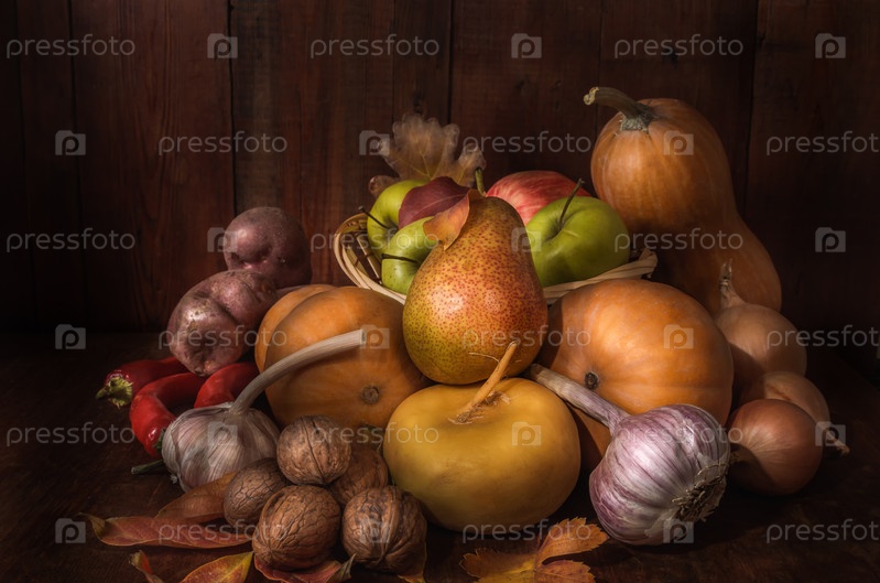 Фрукты и овощи на темном деревянном фоне в деревенском стиле