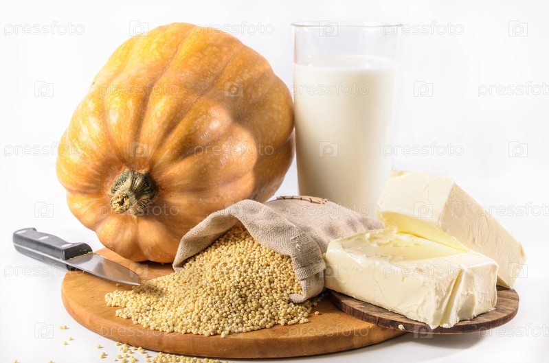 Тыква, просо и другие ингредиенты для тыквенной каши на светлом фоне