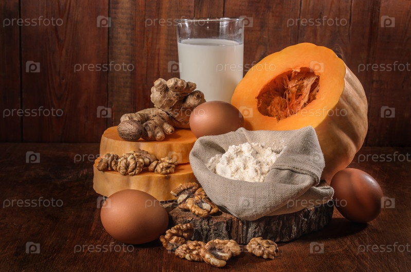 Тыква и ингредиенты для тыквенной запеканки с орехами на темном фоне