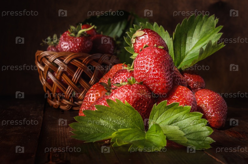 Ягоды спелой клубники на темном деревянном фоне в деревенском стиле