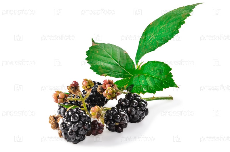 Спелая ежевика с листьями на белом фоне с мягкой тенью