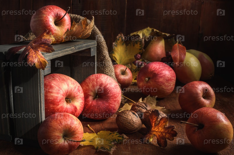 Яблоки оптом на темном деревянном фоне в деревенском стиле
