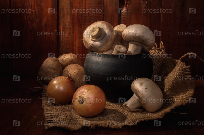 Грибы в чугунном горшке на темном деревянном фоне в деревенском стиле