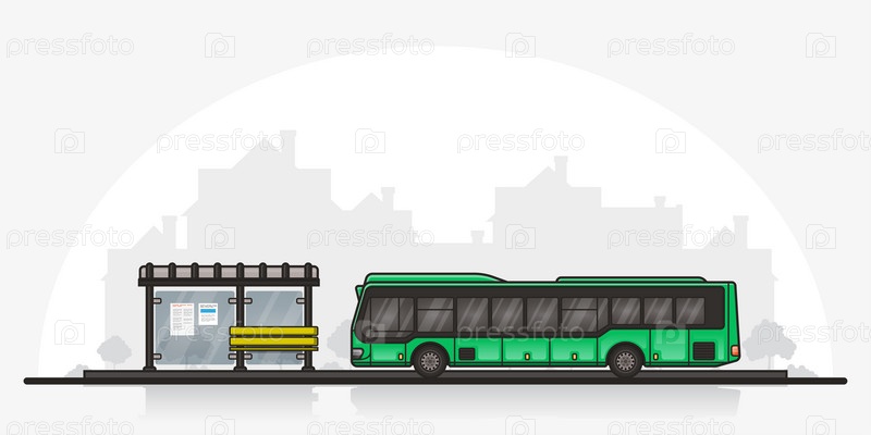 Изображение автобуса, остановившегося возле автобусной остановки на фоне силуэта города. Концепция общественного транспорта. Линейная иллюстрация в плоском стиле