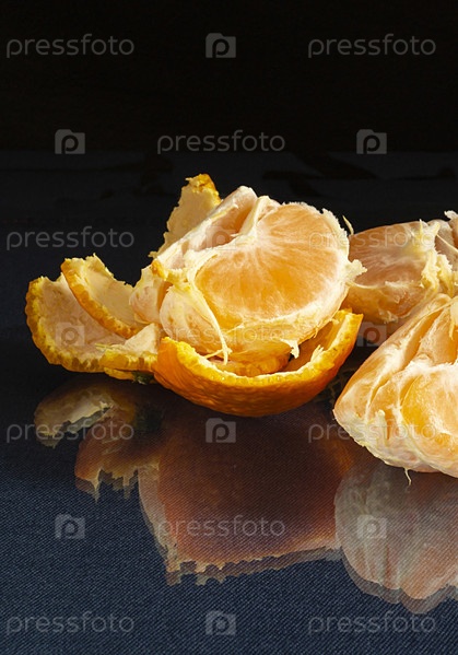 Сегменты мандарина на стеклянном столе с отражением