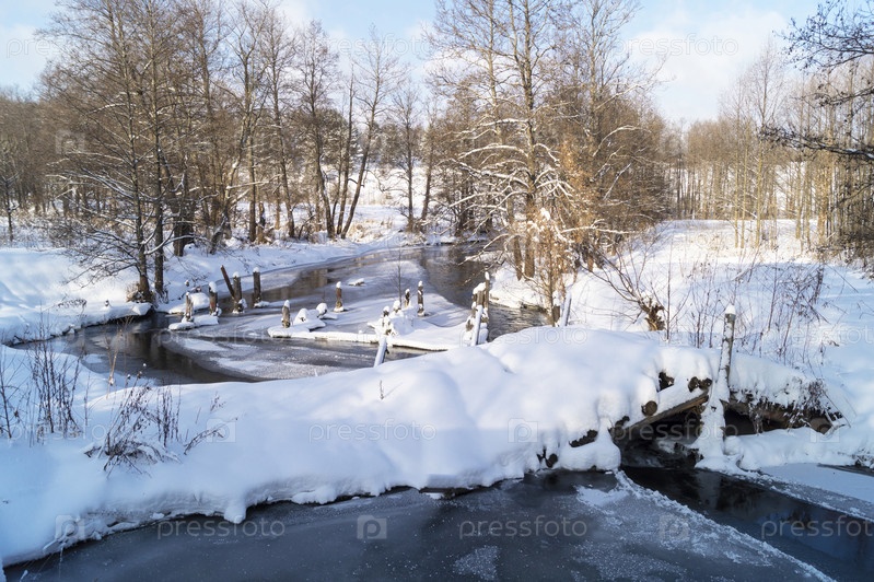 Поток в зимнем лесу на фоне голубого неба с облаком