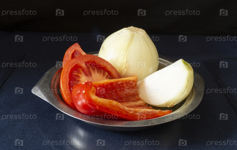 Сладкий перец и лук в тарелке на стеклянном столе с отражением