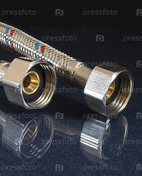 Металлический шланг для воды лежит на столе с отражением
