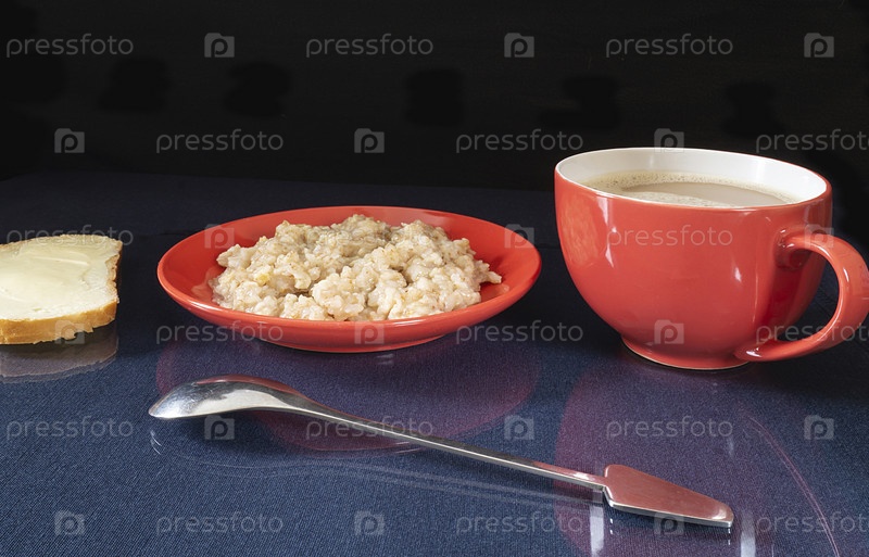 Овсяная каша и кофе на утренней трапезе лежат на стеклянном столе