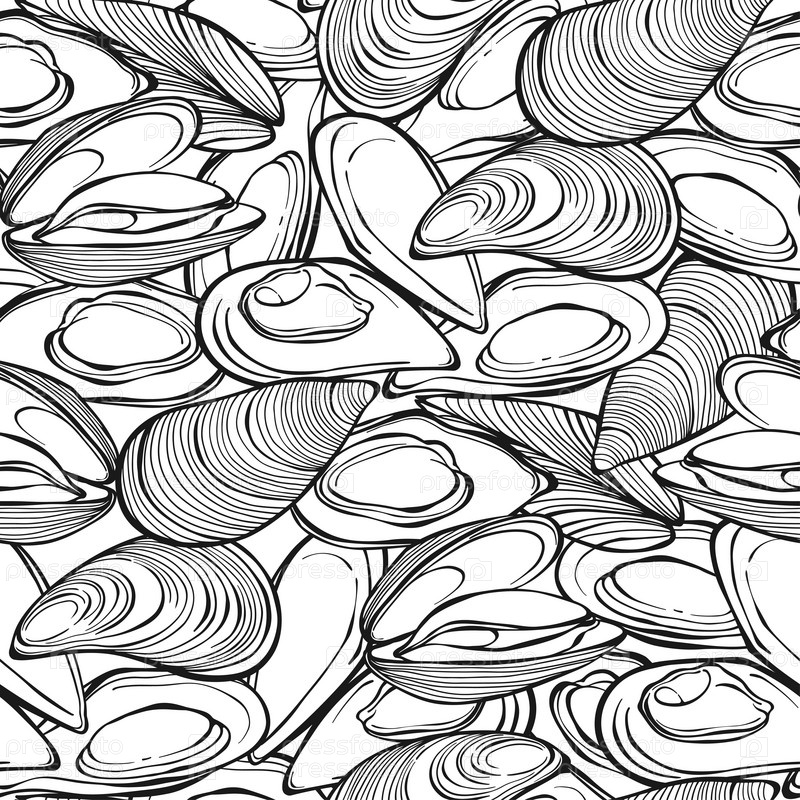 Мидии бесшовные модели на белом фоне. Вектор. Черное и белое. Идеально подходит для шаблонов дизайна, обоев, упаковки, ткани и текстиля