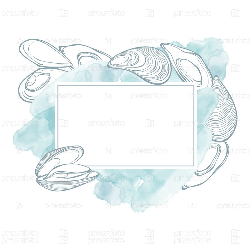 Моллюски. Концепция морепродуктов. Векторный макет декоративный логотип, меню, печать карт, приглашение, дизайн фона