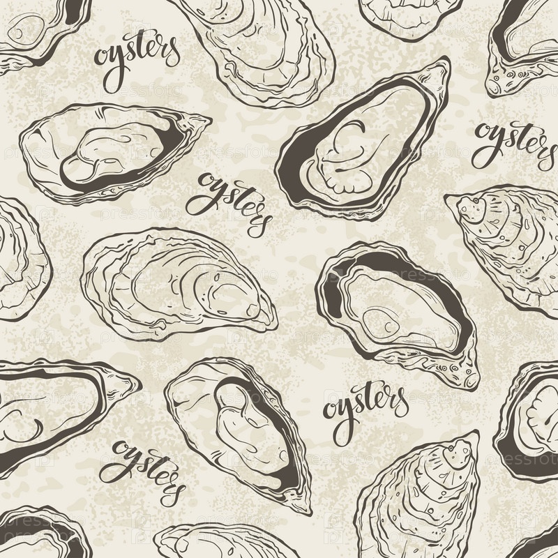 Устрицы бесшовный узор на текстурированном фоне. Вектор. Идеально подходит для шаблонов дизайна, обоев, упаковки, ткани и текстиля