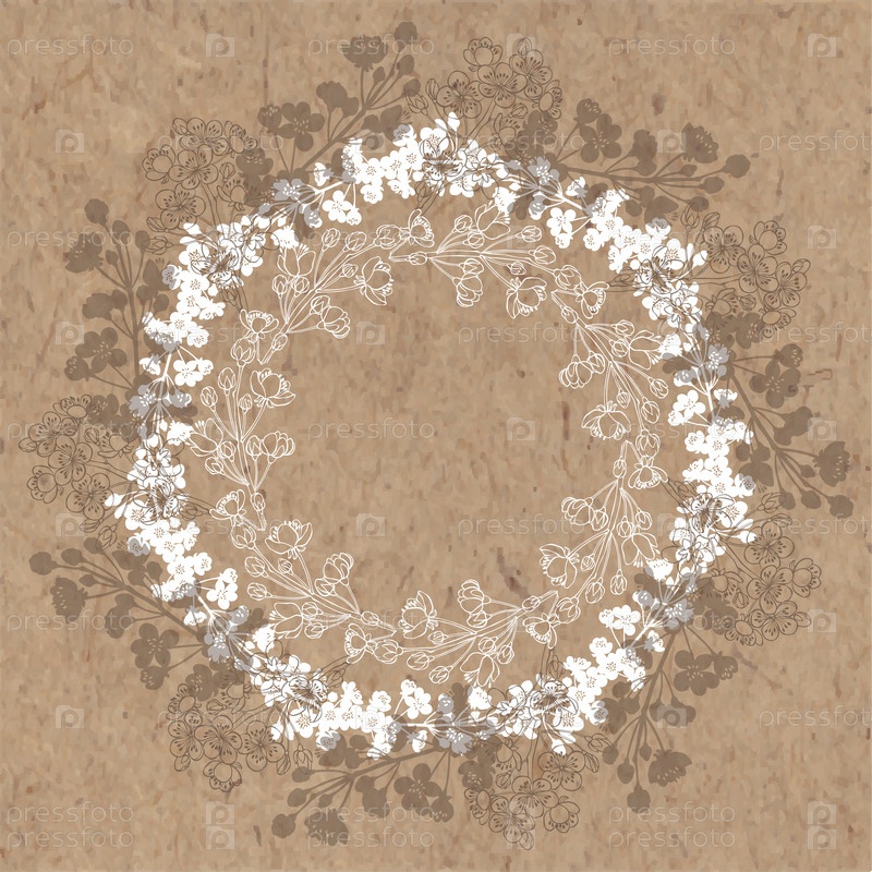 Цветущие ветки абрикоса. Вектор. Фон природы. Цветочный векторный венок с местом для текста на крафт-бумаге. Иллюстрация с местом для текста может быть использована для создания открытки, меню или пригласительного билета
