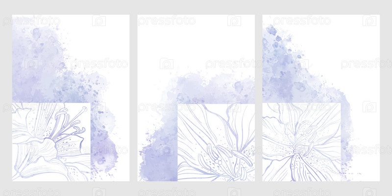 Предварительно сделанный дизайн с цветами лилии, акварельным всплеском фиолетового цвета и местом для текста. Векторный макет декоративной открытки или приглашения дизайн фона, дизайн обоев. Три разные версии на весеннюю тему