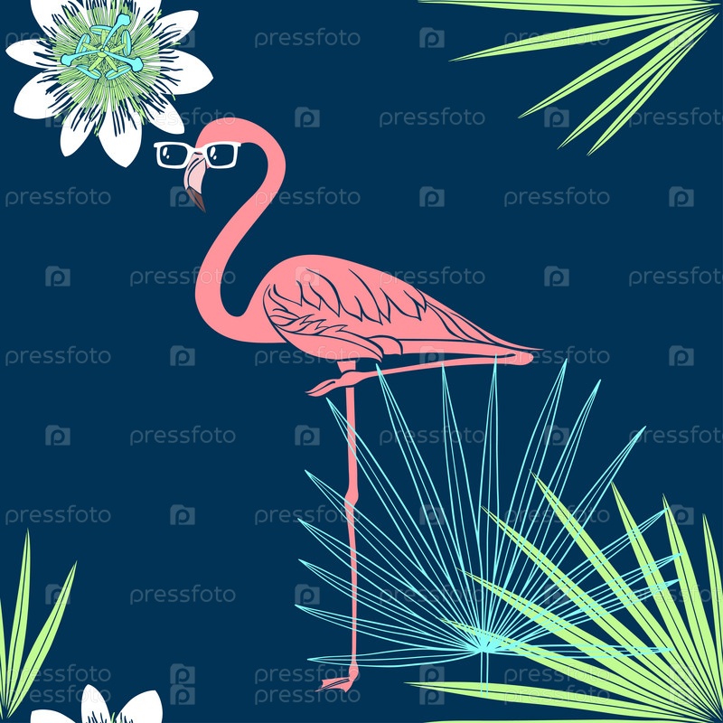 Тропический бесшовный рисунок с фламинго. Яркая векторная иллюстрация с элементами мультфильма. Идеально подходит для шаблонов дизайна, обоев, упаковки, ткани и текстиля