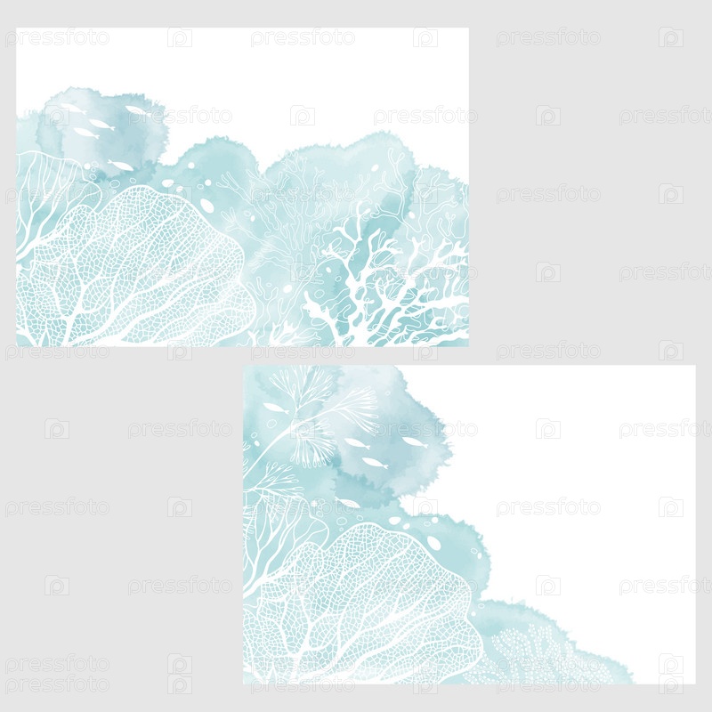 Набор карточек с водорослями, акварельными пятнами и местом для текста. Концепция морского орнамента. плакат, пригласить. Векторный макет декоративной поздравительной открытки или приглашения дизайн фона. Два разных варианта