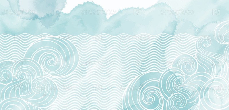 Готовый дизайн на морскую тематику с волнами, акварелью и местом для текста. Векторный макет декоративной поздравительной открытки или приглашения дизайн фона