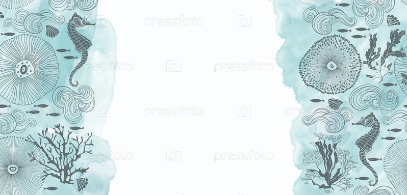 Готовый дизайн на морскую тематику с морскими коньками, рыбками, ракушками, кораллами, акварелью и местом для текста. Векторный макет декоративной поздравительной открытки или приглашения дизайн фона