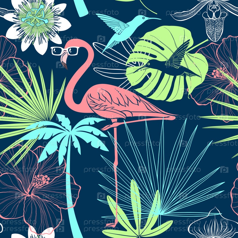 Тропический бесшовный рисунок. Яркая векторная иллюстрация с элементами мультфильма. Идеально подходит для шаблонов дизайна, обоев, упаковки, ткани и текстиля