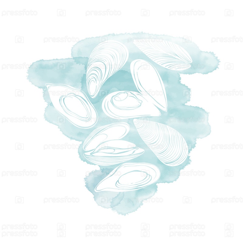 Мидии на синем фрагменте акварели. Ручной рисунок векторного набора шаблонов для дизайна меню, упаковки, ресторанов и общественного питания. Нарисованные от руки изображения