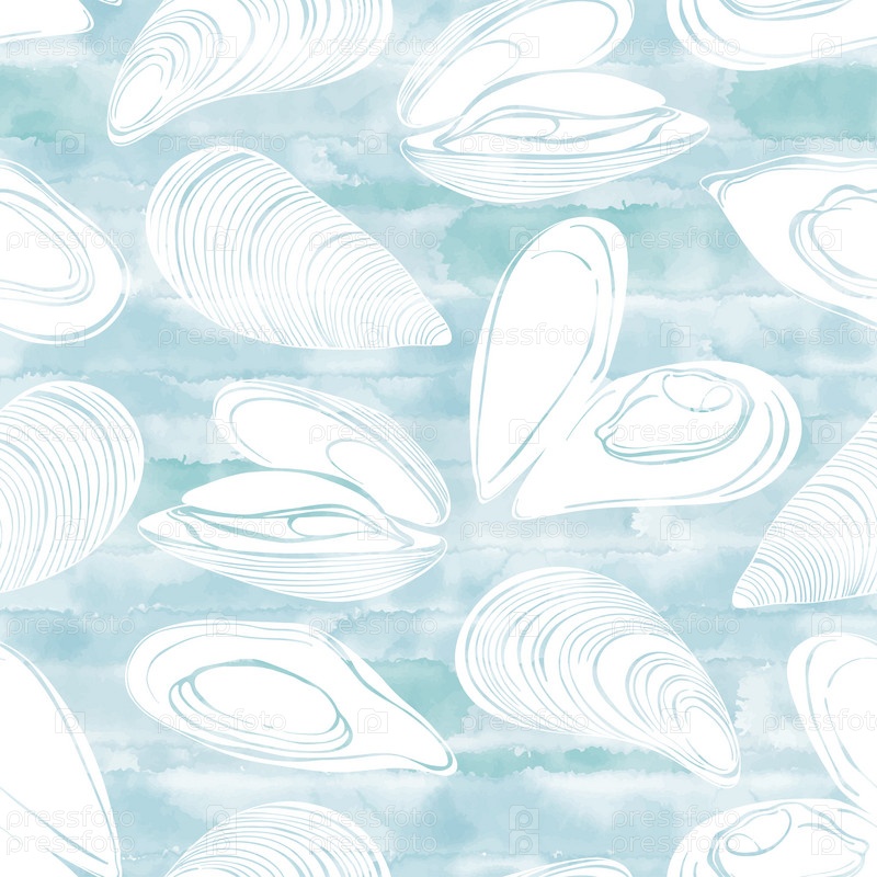 Бесшовный узор с мидиями на синем акварельном фоне. Пищевая векторная иллюстрация. Шаблоны для дизайна меню, упаковки, ресторанов и кейтеринга. Нарисованные от руки изображения. Силуэты